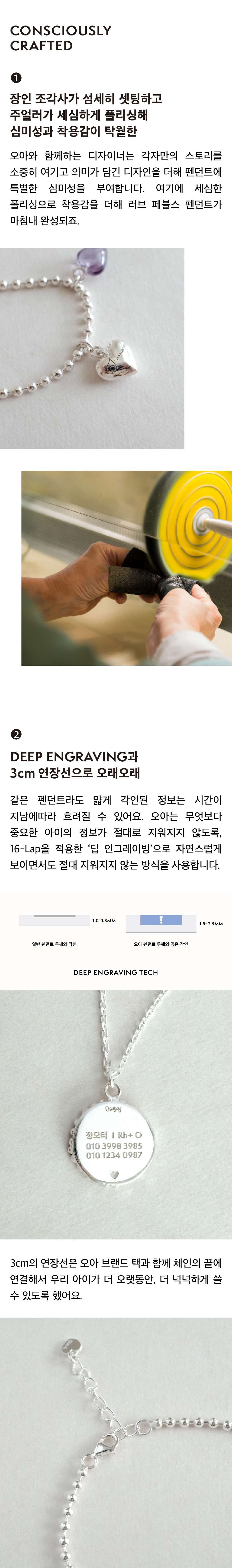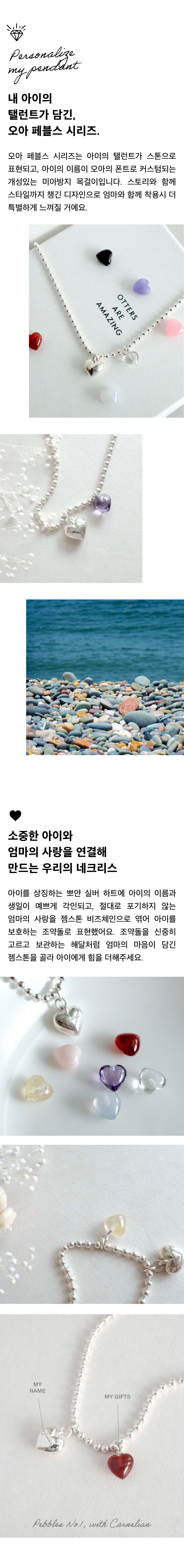 아이를 상징하는 뽀얀 실버 하트 펜던트에 아이의 이름이 예쁘게 각인되고, 절대로 포기하지 않는 엄마의 사랑을 볼륨감있는 하트 셰입의 스톤으로 깎아 매끈한 체인에 엮어낸 모던한 느낌의 네크리스입니다. 아이를 보호하는 조약돌로 표현된 다양한 컬러의 의미가 담긴 젬스톤은 아이에게 힘을 더해줄거에요.