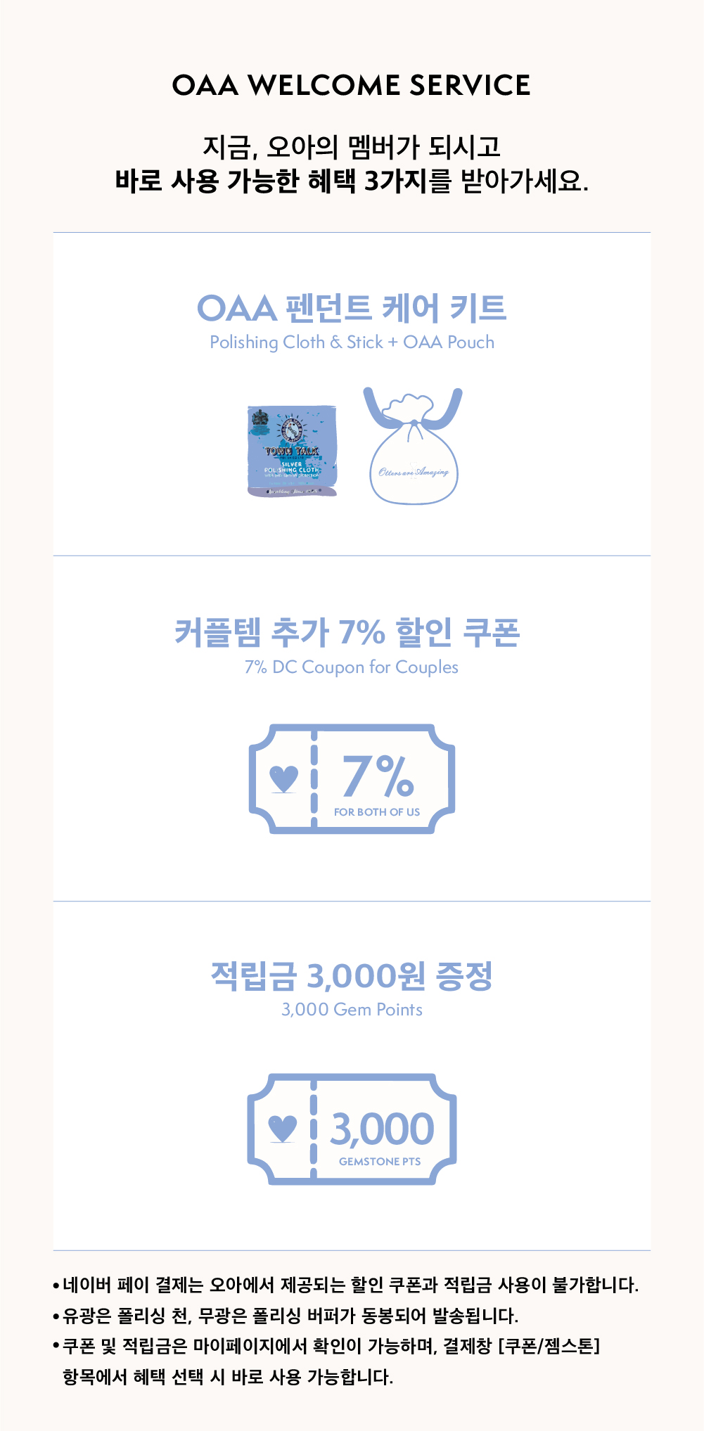 Oaa의 주얼리는 현대의 레이저 기술과 중세의 조각방식을 함께 접목하고, 금과 은을 재료로 엄격한 품질 관리를 거쳐 핸드 크라프트 방식으로 제작하고 있습니다. 대량 생산 시스템이 아닌, 주문과 동시에 제작되는 오더 메이드 제품의 특성 상 제작 진행 후 취소, 반품 및 교환이 불가합니다.