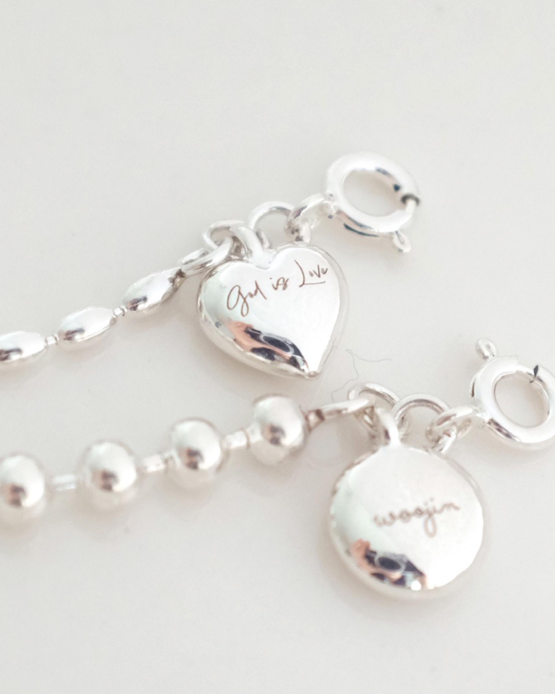 세상에서 가장 반짝이는 이름이 찾아왔습니다. 아이를 향한 엄마의 마음과 생각을 상징하는 하트와 서클 셰입의 볼륨감 있는 펜던트에 아이의 이름 또는 이니셜을 세련된 텍스트로 커스터마이징 할 수 있는 브레이스렛으로, 에그 체인과 함께 매치되어 반짝거림이 남다르답니다.