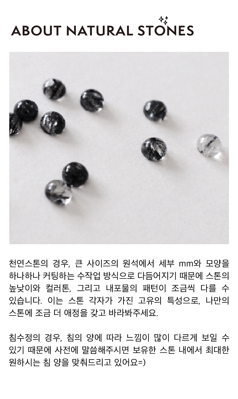 금, 은, 스톤의 재료적 성질에 따라 모든 공정은 전문 세공사들의 정밀하고 세심한 수작업으로 제작되고 있습니다. 크라프트 방식의 특성 상 불가피하게 생길 수 있는 스크래치, 미세한 찍힘과 기포가 있을 수 있기에 해당 특성을 인지하신 후 신중한 구매를 부탁드립니다. 천연 스톤이 세팅 된 제품은 원석마다 내포물과 색상 톤의 차이가 있습니다. 이는 원석 고유의 특성으로 불량이 아님을 안내드립니다.